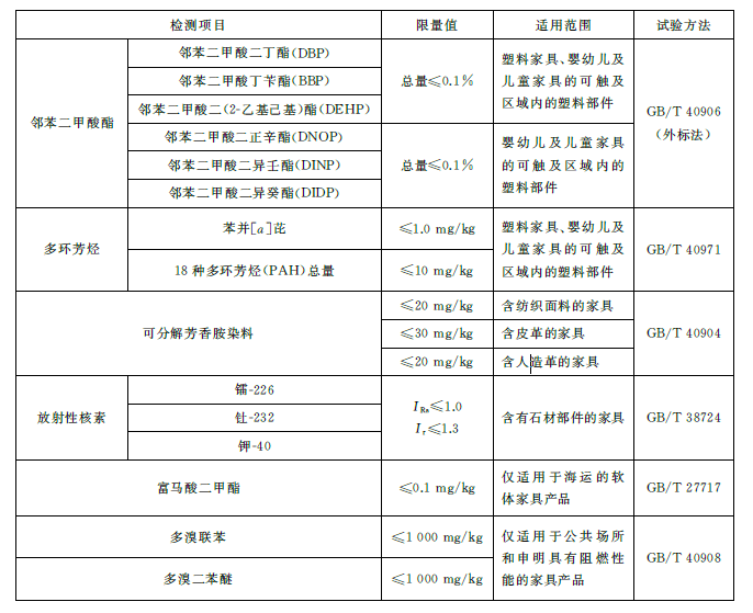 不同的有害物质限量适用于不同材质类型的家具。